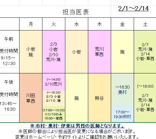 2月上旬担当医表(2/1~2/14) 26.01.26 NEWS 【火】 ・2/3 午前 小岩 午後 14:00~16:30 小岩 17:00~19:30 草西 ・2/10 午前 荒川 午後 14:00~14:30 荒川 15:00~19:30 草西【土】 ・2/7 荒川・施 ・2/14 小岩・草西 土曜日午後の受付時間は16:00までとなります。※医師の都合により担当医が変更になる場合がございます。変更はホームページまたは予約サイトよりご確認をお願いします。
